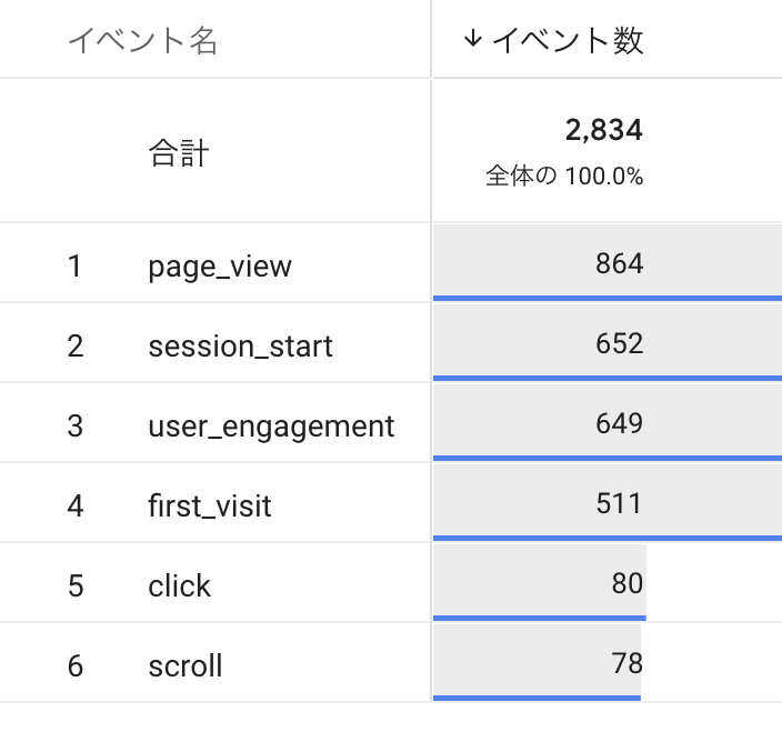 このページが表示された(page_view)のが864回で、このページからセッションを開始された(session_start)ことは652回あり、初めての訪問だった(first_visit)ことが511回ありました。そしてこのページの90%の位置までスクロール(scroll)されたのが78回で、外部ドメインへのリンクへのクリック(click)が80回発生しています。